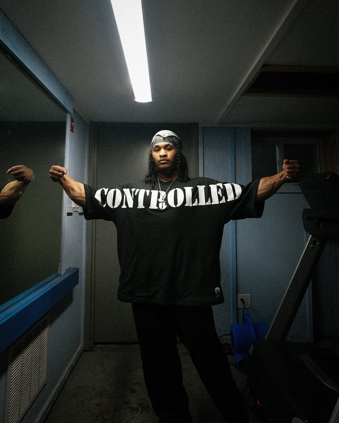 This oversized tee, crafted from durable cotton blend, is designed as a 'pump cover' with a streetwear aesthetic. The 'CONTROLLED' graphic adds a bold, customizable design option for fitness clients.